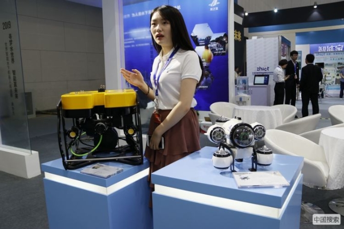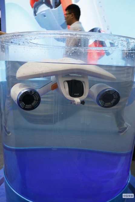 天津深之藍海洋設(shè)備科技有限公司展示白鯊MINI水下機器人。