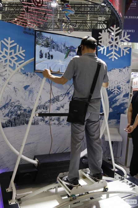 參觀者體驗世界智能大會上展出的奇幻滑雪VR設(shè)備。