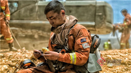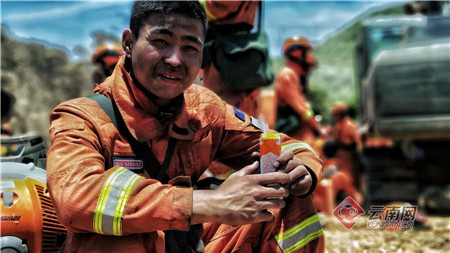 撲火人員在休息間歇吃干糧。陳坤 茹龍俊 覃啟程 攝