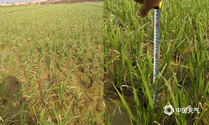 圖為高溫干旱導(dǎo)致蒙自市水稻生長發(fā)育受損,移栽苗高比常年同期偏低8厘米。(圖/紅河州氣象局)