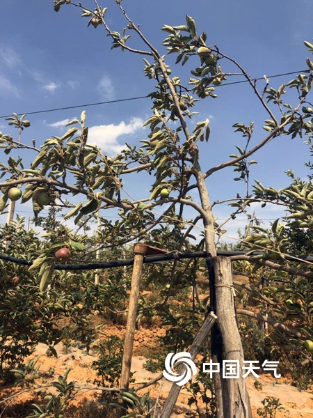 圖為曲靖市馬龍區(qū)舊縣蘋果園,蘋果樹頭只見果稀葉蔫。(圖/陳思彤)