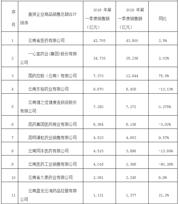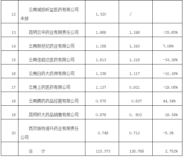 據(jù)2019 年統(tǒng)計直報前一季度數(shù)據(jù)統(tǒng)計,云南省藥品流通行業(yè)排名前20 名的企業(yè)2019 年一季度銷售額共126.768 億元(含稅銷售額),占一季度銷售總額的75%,集中度逐年提高。
