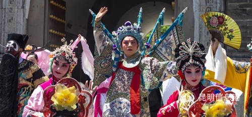 隨后,在近日樓前,伴著云南原創(chuàng)滇歌《彩云之南滇劇美》優(yōu)美的旋律,全國首個戲曲快閃活動在近日樓前上演。來自“國韻流芳”青年研習(xí)會、云南省滇劇院、紅領(lǐng)巾少兒京劇培訓(xùn)中心春城小學(xué)京劇班的演員們,載歌載舞,用一首云南獨有的本土戲曲,表達(dá)著對家鄉(xiāng)的熱愛和對祖國的美好祝福。