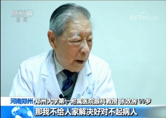 在鄭州大學(xué)第一附屬醫(yī)院,有一位國內(nèi)著名的眼科專家,名叫張效房,他是我國眼內(nèi)異物研究的奠基人和眼外傷專業(yè)的學(xué)術(shù)帶頭人,今年已經(jīng)是99歲了。70年來,他讓無數(shù)患者重見光明,培養(yǎng)了大量的眼科學(xué)臨床人才,直到如今近百歲高齡,他依然堅(jiān)持在臨床一線。用張效房的話說:活著就要為國家做出貢獻(xiàn)。