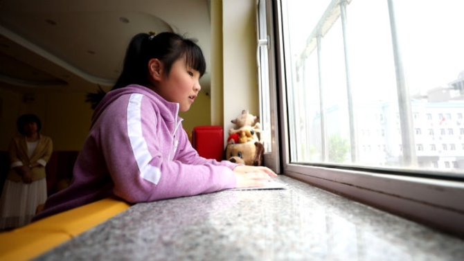 9歲的小瑞童摸讀盲文