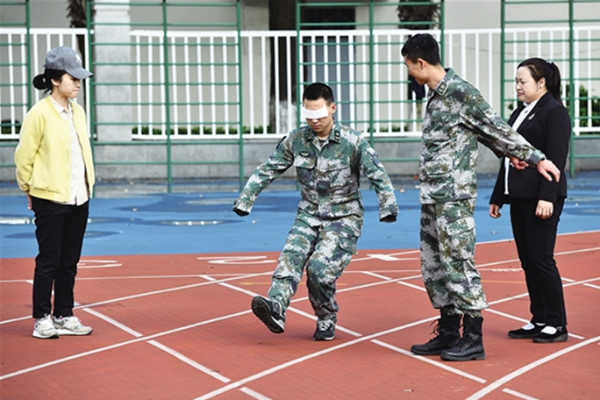 在陸軍軍醫(yī)大學操場上,杜富國在家人和戰(zhàn)友的陪伴下進行下肢力量康復訓練。