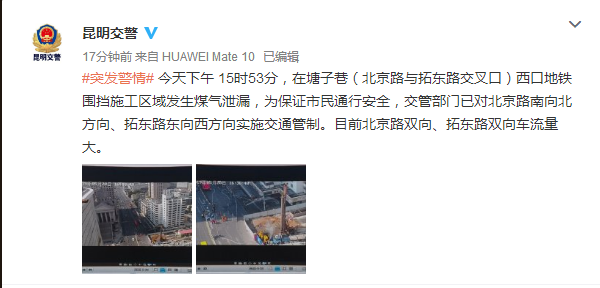 昆明信息港訊 據(jù)昆明交警官方微博發(fā)布,20日15時(shí)53分,在塘子巷(北京路與拓東路交叉口)西口地鐵圍擋施工區(qū)域發(fā)生煤氣泄漏,為保證市民通行安全,交管部門已對(duì)北京路南向北方向、拓東路東向西方向?qū)嵤┙煌ü苤啤D壳氨本┞冯p向、拓東路雙向車流量大。
