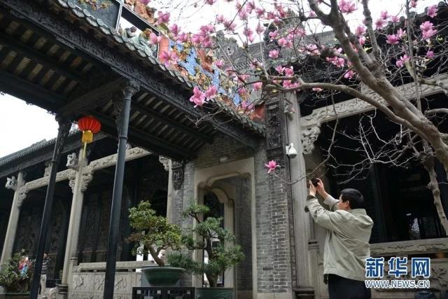 百年陳氏書院內(nèi)玉堂春盛放,游客駐足拍照。新華網(wǎng)發(fā) 許建梅攝