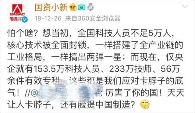 怕個(gè)啥?想當(dāng)初,全國科技人員不足5萬人,核心技術(shù)被全面封鎖,一樣搭建了全產(chǎn)業(yè)鏈的工業(yè)格局,一樣搞出兩彈一星;而現(xiàn)在,僅央企就有153.5萬科技人員、233萬技師、56萬余件有效專利,這些都是我們應(yīng)對卡脖子的底氣!