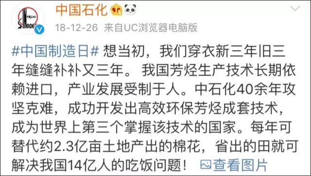 @中國石化:我們用40余年成功開發(fā)出高效環(huán)保芳烴成套技術(shù),成為世界上第三個(gè)掌握該技術(shù)的國家,每年可替代約2.3億畝土地產(chǎn)出的棉花!