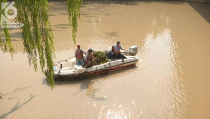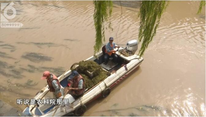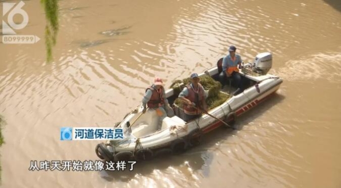 20日中午,在盤龍江圓通大橋附近,記者看到,河道內(nèi)的水流確實(shí)比較渾濁,泛著土黃色,水草裸露,水流也沒有之前那么順暢。有幾名河道保潔員正在打撈水草……