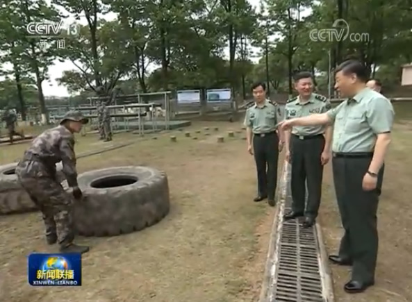 學(xué)院訓(xùn)練場上,學(xué)員們生龍活虎、喊聲震天,一派實戰(zhàn)化練兵景象。習(xí)近平走到障礙訓(xùn)練場旁,察看學(xué)員進行障礙訓(xùn)練情況。極限訓(xùn)練對于錘煉學(xué)員體能極限、意志極限、心理極限,提高戰(zhàn)場適應(yīng)能力很有意義。習(xí)近平步行進入極限訓(xùn)練場,詳細了解有關(guān)訓(xùn)練設(shè)施和訓(xùn)練情況。學(xué)員們進行了阻絕墻跳水、翻越懶人梯、跨越步步高、翻越高墻、攀爬云梯、攀越高空蕩木橋、扛圓木等訓(xùn)練??吹綄W(xué)員們摸爬滾打一身泥水,迎著障礙一往無前,習(xí)近平很高興。