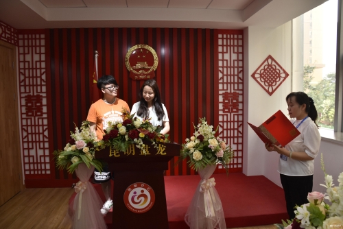 當天,來到盤龍區(qū)政務(wù)服務(wù)中心的一對對情侶喜笑顏開,整個大廳洋溢著幸福的氣氛。工作人員為新人們?nèi)√?、審核證件、指導(dǎo)正確填表、打印證件、頒發(fā)結(jié)婚證。最幸福的場景在婚姻頒證廳上演,新人們耐心地排隊等候宣誓、頒發(fā)結(jié)婚證,在莊嚴的國旗、國徽下宣讀《結(jié)婚誓言》,共同許下相伴今生的約定。