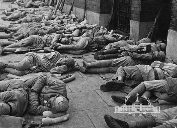 這是一張拍攝于上海戰(zhàn)役時(shí)期的珍貴歷史照片。畫(huà)面中的解放軍戰(zhàn)士,和衣而眠,露宿于街頭,充分體現(xiàn)了解放軍嚴(yán)格的軍紀(jì)和“不拿群眾一針一線”的寶貴品質(zhì)。