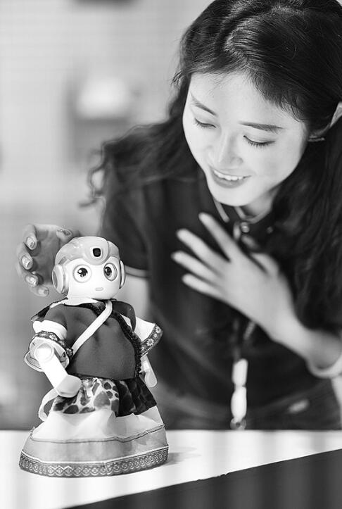 參展企業(yè)工作人員與“悟空機器人”互動。 新華社記者 秦晴 攝