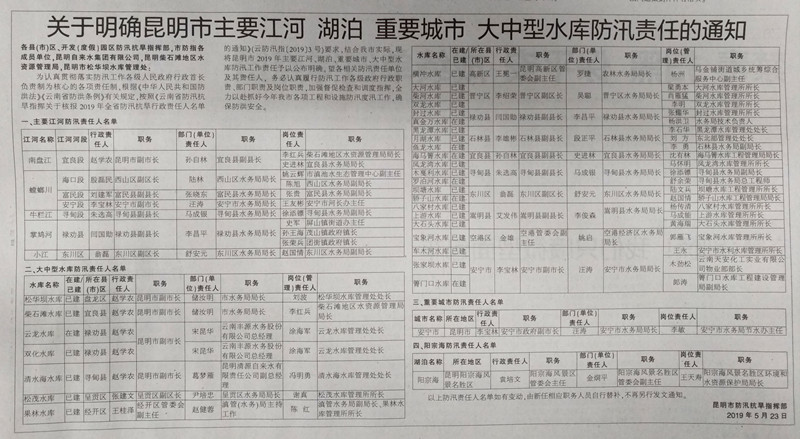 昆明信息港 記者周碩 5月23日,昆明市防汛抗旱指揮部發(fā)布通知,公布了昆明市2019年主要江河、湖泊、重要城市、大中型水庫防汛責(zé)任人名單及其工作責(zé)任,確保防洪安全。