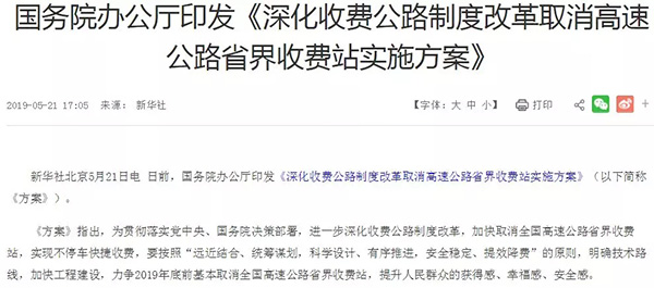 近日,國辦印發(fā)《深化收費(fèi)公路制度改革取消高速公路省界收費(fèi)站實(shí)施方案》,提出力爭2019年底前基本取消全國高速公路省界收費(fèi)站,各省(區(qū)、市)高速公路入口車輛使用ETC比例達(dá)到90%以上,實(shí)現(xiàn)手機(jī)移動支付在人工收費(fèi)車道全覆蓋。