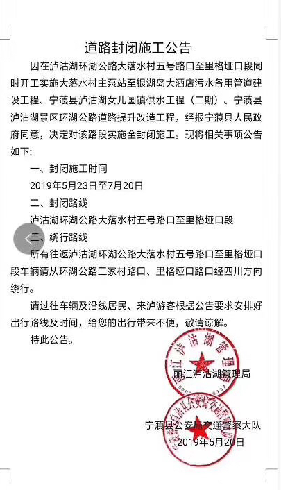 記者從瀘沽湖管理局了解到,因在瀘沽湖環(huán)湖公路大落水村五號路口至里格埡口段同時(shí)開工,主要實(shí)施大落水村主泵站至銀湖島大酒店污水備用管道建設(shè)工程、寧蒗縣瀘沽湖女兒國鎮(zhèn)供水工程(二期)、寧蒗縣瀘沽湖景區(qū)環(huán)湖公路道路提升改造工程。經(jīng)報(bào)寧蒗縣人民政府同意,決定對該路段實(shí)施全封閉施工。封閉施工時(shí)間為,2019年5月23日至7月20日。
