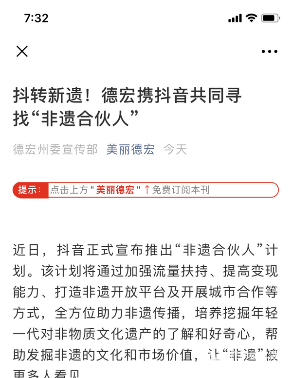 昆明信息港訊 記者勞學麗 5月23日,云南省德宏州委宣傳部發(fā)布消息,將啟動抖音非遺合伙人計劃的云南德宏站,與抖音一起共同尋找德宏當地的非遺傳承人。