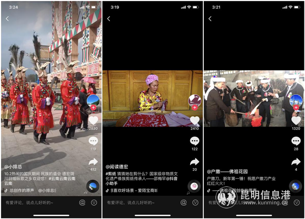 傣族剪紙、傣族象腳鼓舞、傣族孔雀舞、阿昌族戶撒刀、目瑙縱歌等德宏當地的非物質文化遺產在抖音上有大量相關內容,受到不少用戶的喜愛。