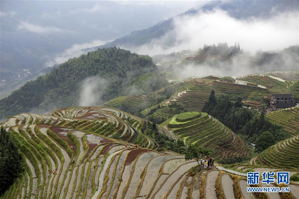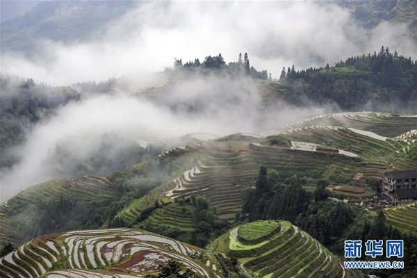 這是5月26日拍攝的廣西龍脊梯田雨后景色。 雨后的廣西龍勝各族自治縣龍脊梯田云霧升騰,村寨、梯田在云海中若隱若現(xiàn),美如仙境。 新華社發(fā)(劉滿倉/攝)