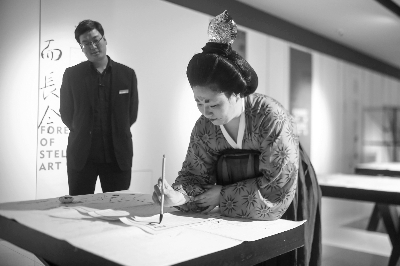 網(wǎng)紅“唐本俑”敖珞珈來到西安碑林文創(chuàng)旗艦店參觀,并饒有興致地提筆書寫。