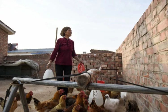 圖為李耀梅在給雞喂水。馮開華/攝