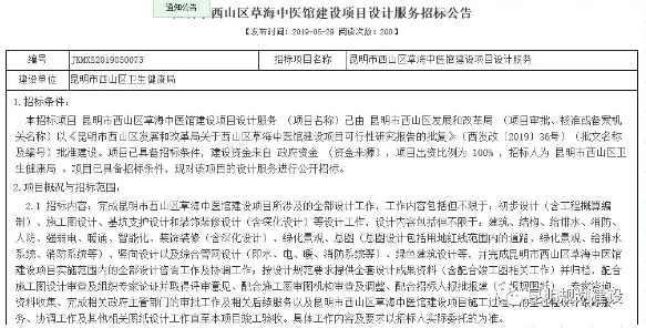 昆明信息港訊 (昆明日?qǐng)?bào) 記者吳勁松)5月29日,西山區(qū)衛(wèi)生健康局發(fā)布《昆明市西山區(qū)草海中醫(yī)館建設(shè)項(xiàng)目設(shè)計(jì)服務(wù)招標(biāo)公告》,西山區(qū)計(jì)劃在草海片區(qū)4-1地塊投資12314.81萬元建設(shè)一所中醫(yī)館,共設(shè)置約80張床位。此前4月30日,昆明市西山區(qū)發(fā)展投資集團(tuán)有限公司曾發(fā)布了《昆明市西山區(qū)草海中醫(yī)館項(xiàng)目設(shè)計(jì)施工(EPC)總承包招標(biāo)公告》,但后期又因項(xiàng)目資金來源進(jìn)行調(diào)整,終止招投標(biāo)工作。此次發(fā)布新的招標(biāo)公告,預(yù)示著項(xiàng)目將再次啟動(dòng)。未來,新建成的草海中醫(yī)館,將為西山區(qū)提供一個(gè)優(yōu)質(zhì)的中醫(yī)服務(wù)場(chǎng)所。
