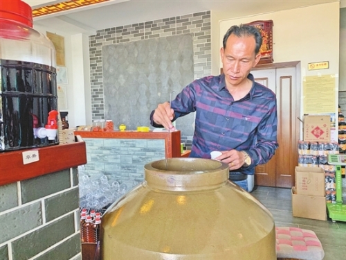 在我們交談的過程中,不時有人來醋莊買醋。對每一位客人,聶承龍都會叮囑醋的食用注意事項。他說,他們現(xiàn)在每年能賣出500噸醋,在保山,下村醋是當(dāng)?shù)厝藦N房里必不可少的調(diào)料,“特別是一碗下村豆粉吃完,再就著剩下的湯汁喝點醋,非常舒服。”