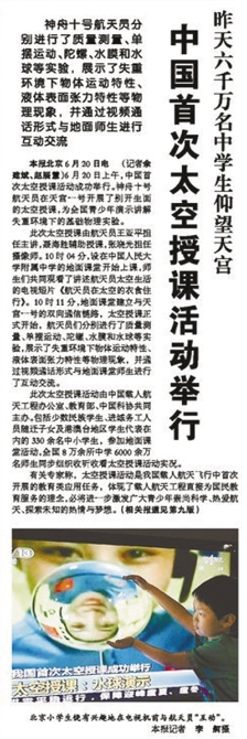 2013年6月21日人民日報頭版報道太空授課。資料圖片 |