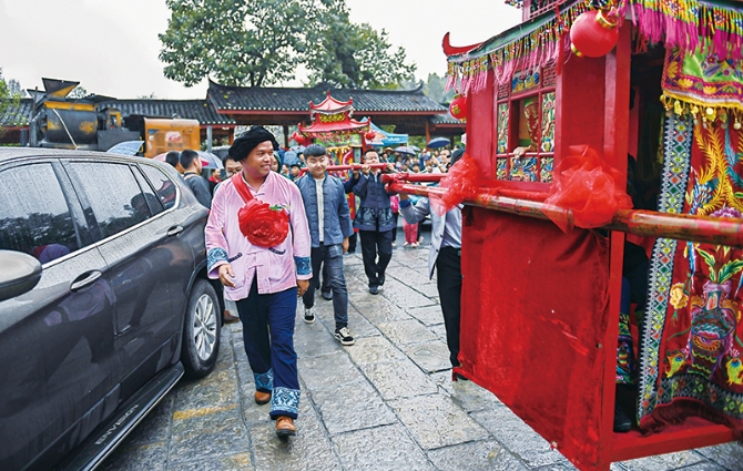 地處武陵山腹地的湖南省花垣縣雙龍鎮(zhèn)十八洞村曾深陷貧困,2013年全村225戶中有136戶是貧困戶,40歲以上的“光棍”有30多人。2013年11月3日,習近平總書記來到十八洞村考察,“同大家一起商量脫貧致富奔小康之策”,首次提出“精準扶貧”重要理念。2018年,已經(jīng)脫貧的十八洞村人均純收入達到12128元,在實踐中探索出了一條脫貧與鄉(xiāng)村振興協(xié)同發(fā)展之路。 圖為2018年9月24日,“脫貧”又“脫單”的十八洞村村民施六金引領(lǐng)娶親隊伍進入婚禮現(xiàn)場。 新華社記者 李尕/攝