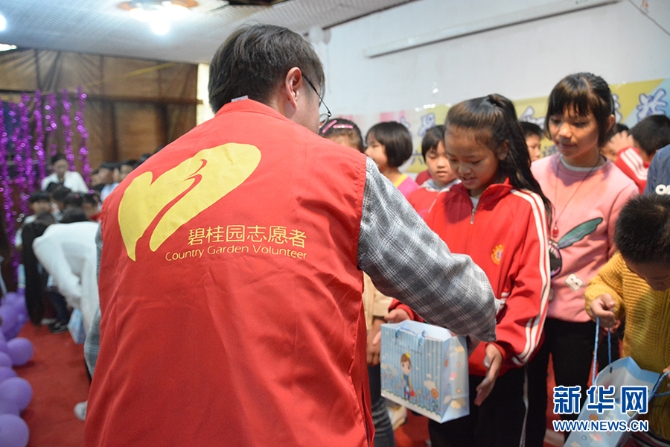 碧桂園云南區(qū)域志愿者在給孩子們分發(fā)六一禮物