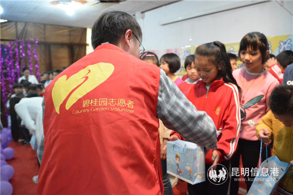 碧桂園云南區(qū)域志愿者在給孩子們分發(fā)六一禮物。