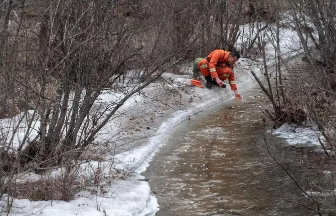 △5月10日,一名進山巡護的消防員在沒有完全消融的溪水邊休息。