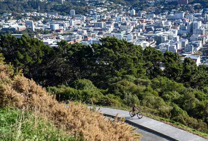 ↑這是2019年6月3日,在新西蘭首都惠靈頓,一名男孩在維多利亞山上騎行。新華社記者郭磊攝