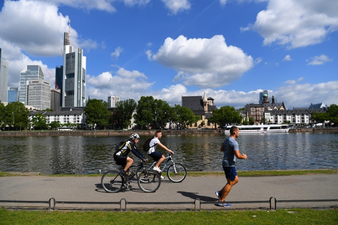 ↑這是2019年5月31日,在德國(guó)法蘭克福,人們?cè)诿酪蚝优闲蓍e健身。新華社記者逯陽(yáng)攝