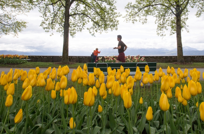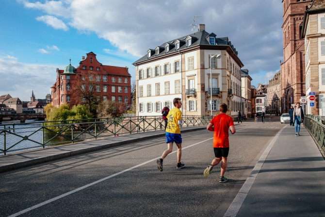 ↑這是2019年3月26日,在法國(guó)斯特拉斯堡,兩名男子在街頭跑步鍛煉。新華社記者張鋮攝
