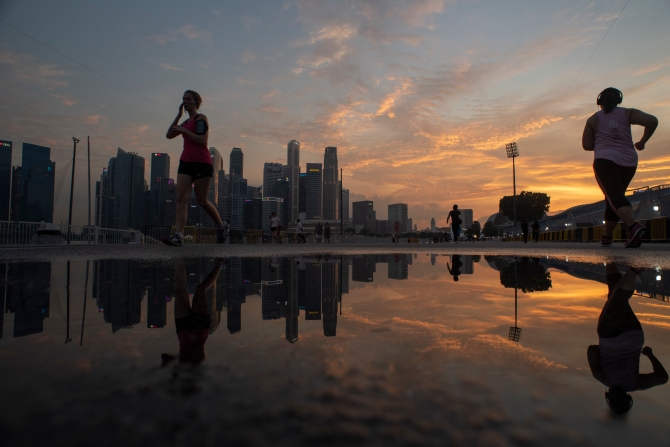 ↑這是2019年4月30日,市民在新加坡市區(qū)跑步。新華社發(fā)(鄧智煒攝)