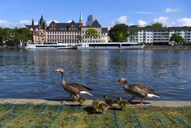 ↑這是2019年5月31日,在德國(guó)法蘭克福,灰雁在美因河畔踱步覓食。新華社記者逯陽(yáng)攝