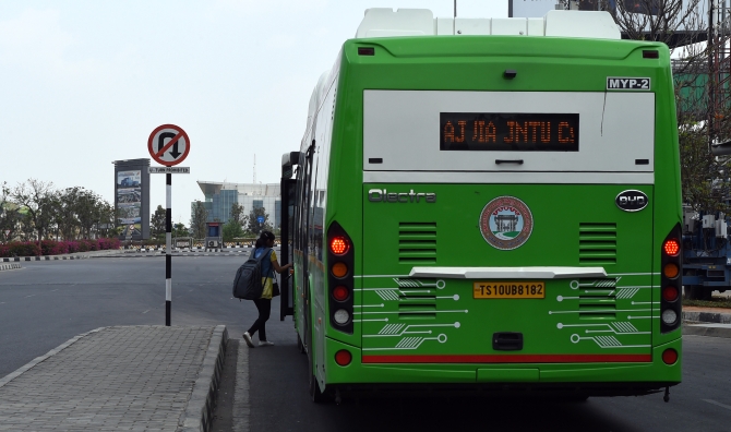 ↑這是2019年3月26日,在印度海德拉巴市,乘客乘坐電動(dòng)大巴出行。新華社記者張迺杰攝