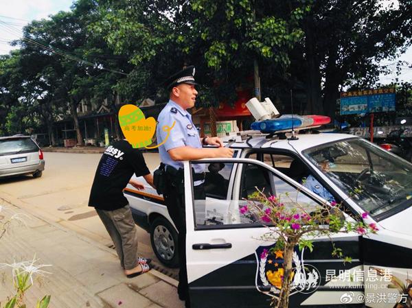 在西雙版納州民族中學考點,一考生忘記攜帶身份證,考點執(zhí)勤民警立即駕駛警車帶上考生趕往附近的旅游度假區(qū)派出所開具身份證明。在民警的幫助下2名考生順利入場參加考試。