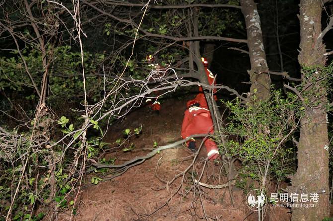 20時33分,根據(jù)現(xiàn)場實際情況,搜救組立即分析,確認營救路線:需從搜救組所處的山峰往下,沿著山脊向溪谷底方向進發(fā),再沿溪谷往上搜救被困者。搜救隊艱難地在灌木叢中開辟出前往溪谷底的路線,并于22時52分到達溪谷底,再沿著谷底往被困者位置向上行進。
