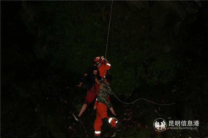 20時15分,搜救組抵達綠玉溪峽谷之上的玉帶路,通過與被困人員共享位置確定地點;發(fā)現(xiàn)此時搜救組已經(jīng)非常接近被困人員,且被困人員能聽到搜救隊在峽谷中呼喚的聲音。在確定了被困者們確實處于綠玉溪峽谷之中,與搜救隊相隔著海拔近300米的懸崖峭壁后,搜救隊分析到隊員無法徒步到達被困者所在位置。此時天色已黑,搜救隊根據(jù)被困人員所提供的情況了解到,他們被困于峽谷之中的一塊約10平方米的巨石之上,左米高的巨石平臺,當時他們是借助巨石旁邊的藤蔓和樹樁爬下去的,現(xiàn)在藤蔓已斷,已經(jīng)無法原路放回,并告訴搜救隊只能從峽谷的下段往上來營救。