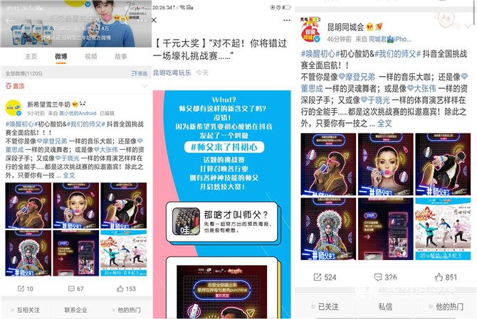 于是#師父來了抖初心#話題被確定,擁有技能的“師父們”被鼓勵上抖音挑戰(zhàn)炫技。但師父并非一些看似遙不可及的人,通過前宣視頻和海報,初心酸奶將“師父”具象化為籃球高手、跆拳道黑帶、唱跳能人、非遺大師、滑板高手等常見的達人,充分煥發(fā)消費者參與感,調(diào)動消費者積極性,上線第一天,挑戰(zhàn)賽的總參與人數(shù)就超過了4萬。