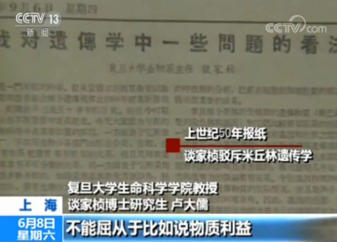 復(fù)旦大學(xué)生命科學(xué)學(xué)院教授 談家楨博士研究生 盧大儒:談先生在這個(gè)過程當(dāng)中也是不斷的(地)抗?fàn)?有一種錚錚鐵骨,不能屈從于比如說(shuō)物質(zhì)利益,不能屈從于一些強(qiáng)權(quán)。