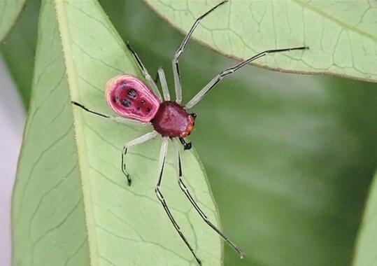 雄蜘蛛個(gè)頭較小,背上有紅色粉色花紋。通訊員林業(yè)杰/攝