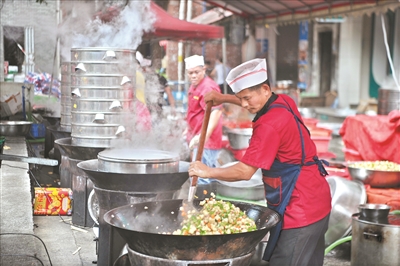 龍?zhí)洞?,幾十個(gè)廚工在張羅龍船飯,有燒肉、河蝦、鹽焗雞、燒鵝、龍船粉等十多個(gè)菜式。大家在席上談笑風(fēng)生,村落之間聯(lián)絡(luò)感情,其樂融融。廣報(bào)全媒體記者 楊耀燁/攝