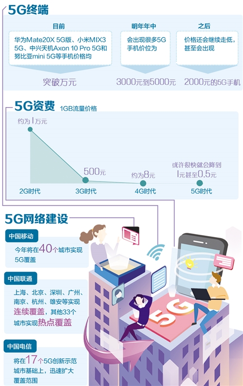 近日,隨著5G商用牌照正式發(fā)放,5G手機成為市場和消費者關(guān)注熱點。華為、小米、中興、OPPO、一加等廠商紛紛表示將在國內(nèi)第一批推出5G商用手機,明年年中還會出現(xiàn)很多3000元到5000元價位的5G手機。同時,業(yè)內(nèi)人士普遍認為在提速降費政策指引下,5G流量單價肯定不會高于4G。隨著網(wǎng)速提升和流量資費下降,未來不僅人人用得起5G,還會出現(xiàn)很多想象不到的新應用——