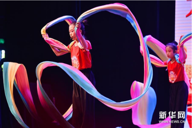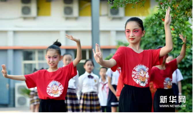 6月11日,在石家莊市青少年宮,裕華西路小學(xué)的學(xué)生表演傳統(tǒng)戲曲選段《天女散花》。 新華社發(fā)張曉峰/攝