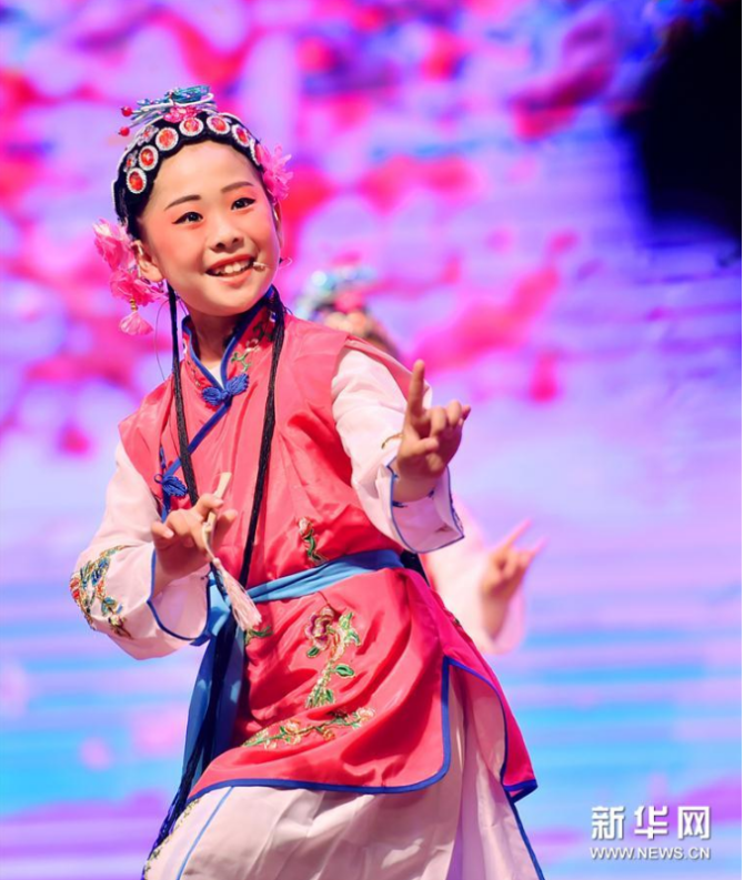 6月11日,在石家莊市青少年宮,裕華西路小學(xué)的學(xué)生表演傳統(tǒng)戲曲選段《桃花村》。 新華社發(fā)張曉峰/攝